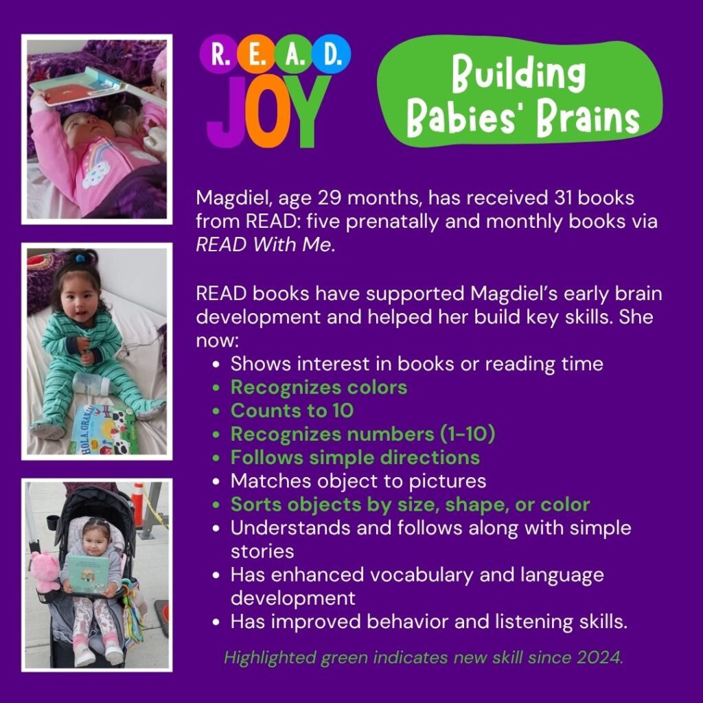 Annie, age 2, has received 28 books from READ: five prenatally and one each month via READ With Me. READ is her family’s only source of books. These books have helped Annie’s brain develop, and she has gained the following skills: